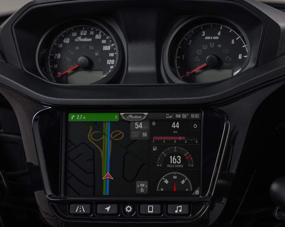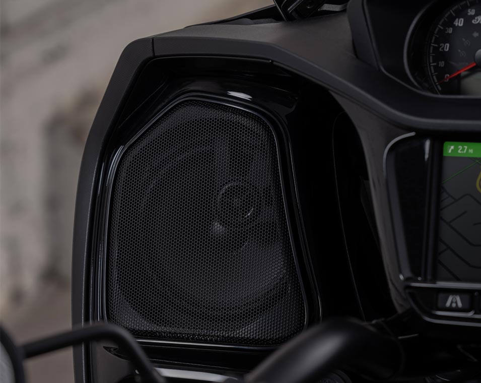 | Infotainment | 7" touchscreen powered by RIDE COMMAND: 7" touchscreen display with real-time clock; ambient air temperature; heading; audio information display; map/navigation; Bluetooth status for phone and headset; vehicle status (tyre pressure, voltage, engine hours, oil change); vehicle info (speed, fuel range, RPM, gear position); current ride data (distance, moving time, stop time, altitude, altitude change); trip meters; ride mode selection; screen brightness; vehicle trouble code readout; Apple CarPlay integration. |