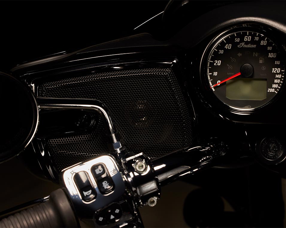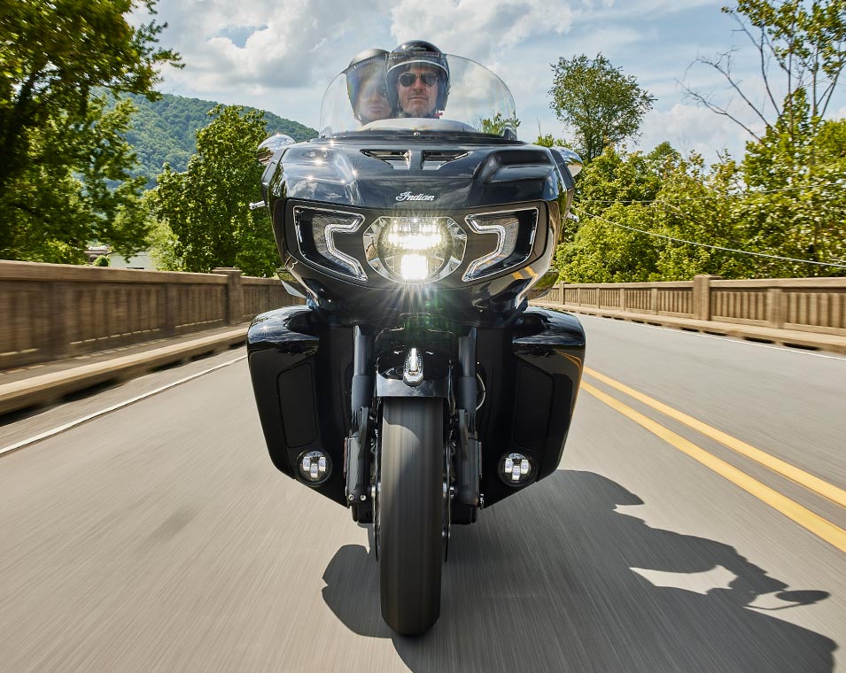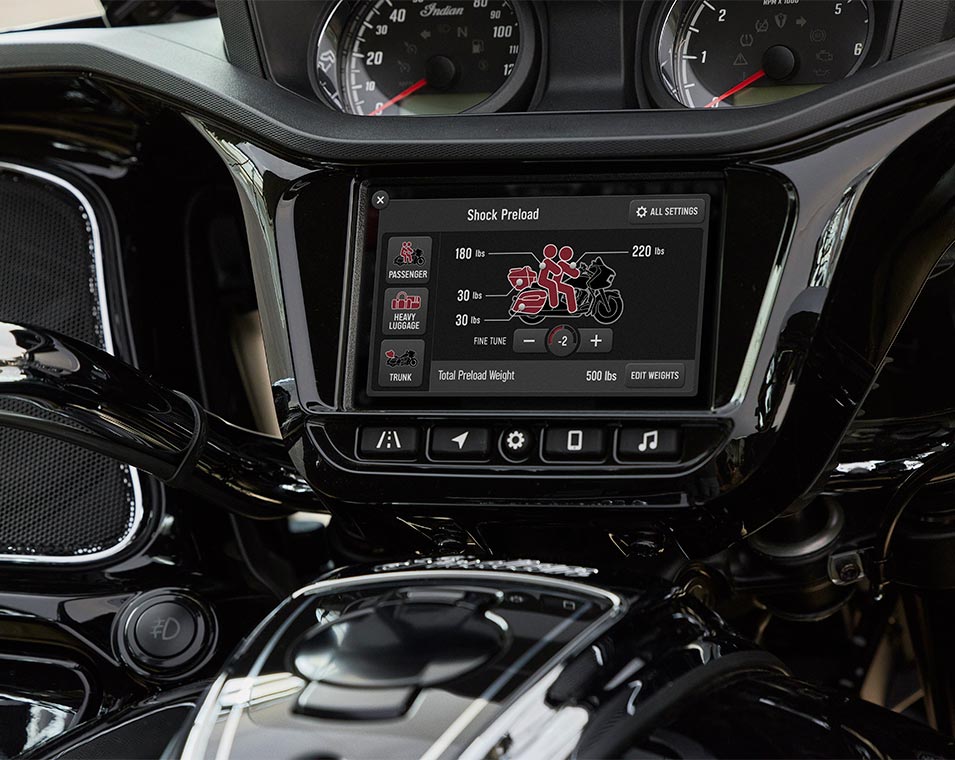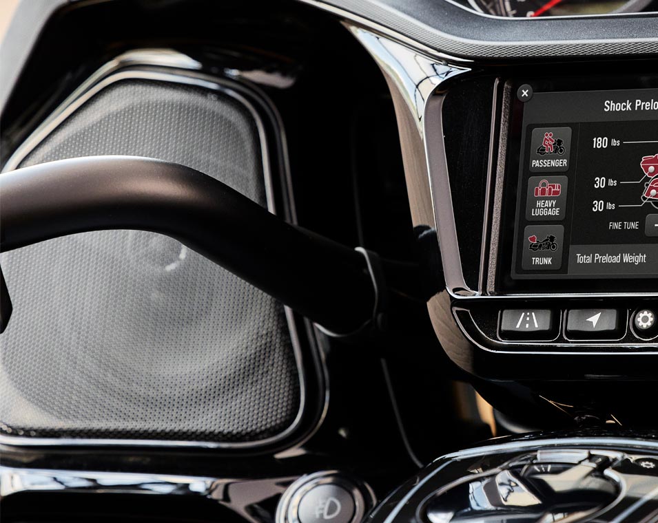 | Standard Equipment | Smart Lean Technology; Electronically Adjustable Rear Suspension Preload; Heated Seat; Integrated Driving Lights in Lower Fairing; Lower Fairing Storage; 7" touchscreen powered by Ride Command with Apple CarPlay integration; Selectable Ride Modes; Rear Cylinder Deactivation; Cruise Control; Tyre Pressure Monitoring; Remote-locking Hard Saddlebags & Trunk; 164 Litres of Storage; Highway Bars; Adjustable Passenger Floorboards; Brembo brakes; ABS; Keyless Ignition; Chassis Mounted Fairing; Power Windshield; Adjustable Fairing Air Flow Vents; Heated Grips; 200 Watt Audio System with AM/FM, Bluetooth, USB, Smartphone Compatible Input, 12V Charging Port |