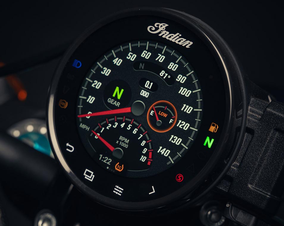 | Infotainment | 4 in Touchscreen powered by RIDE COMMAND. Touchscreen display includes real-time clock; ambient air temperature; heading; audio information display; map/navigation; Bluetooth status for phone and headset; vehicle status (voltage, engine hours, oil change); vehicle info (speed, fuel range, RPM, gear position); current ride data (distance, moving time, stop time, altitude, altitude change); trip meters; ride mode selection; screen brightness; and vehicle trouble code readout. |